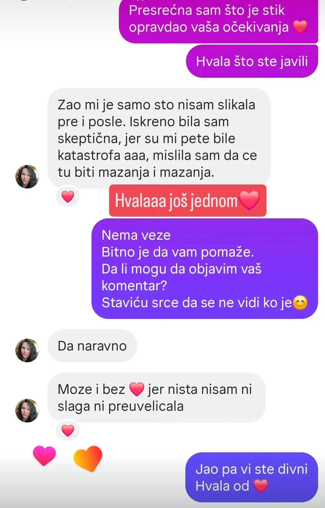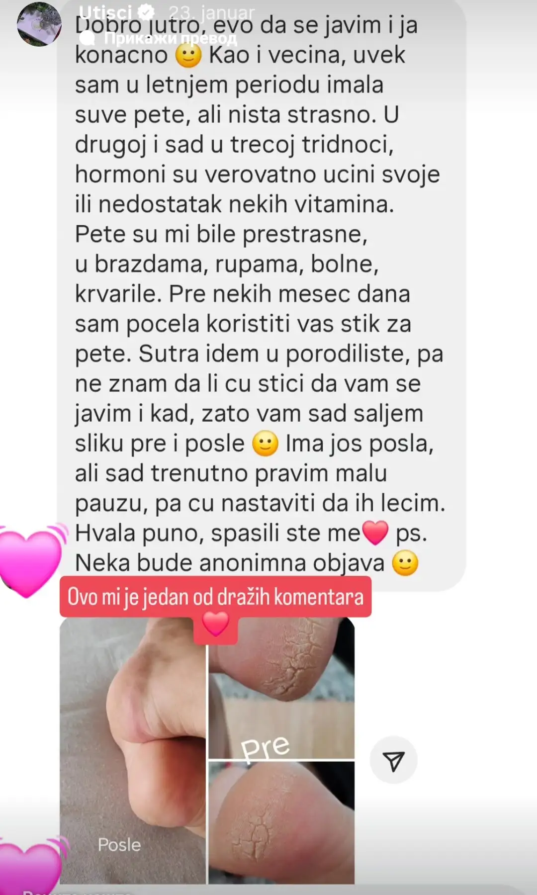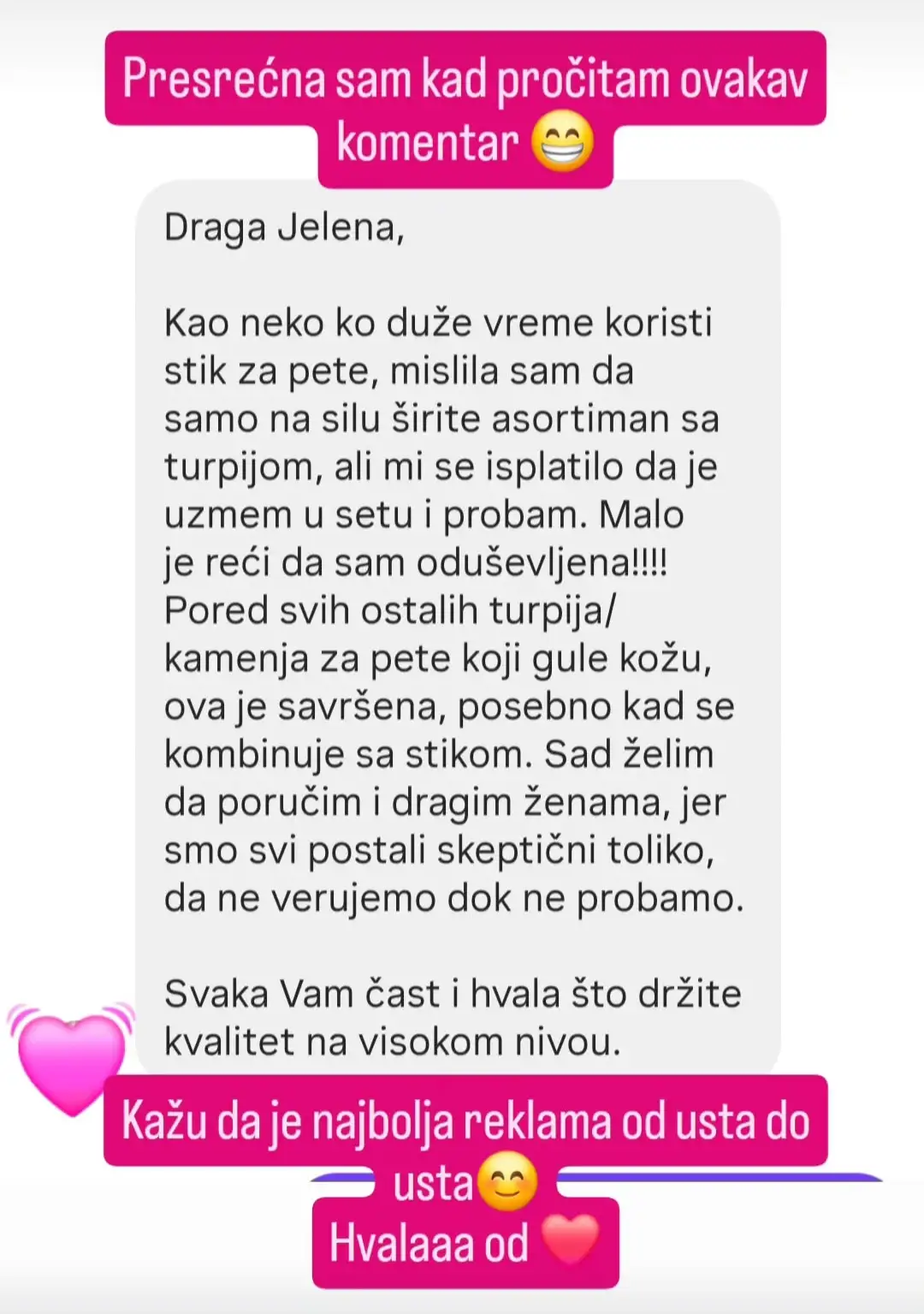 Kupila sam Complete set za pete (veliki i mali stik + nano staklena turpija) i oduševljena sam rezultatima. Već posle nekoliko dana korišćenja pete su mi postale mnogo mekše i glatkije. Veliki stik koristim kod kuće, dok je mali savršen za torbu kada sam u pokretu. Nano staklena turpija je posebno prijatna za korišćenje – nežno uklanja zadebljalu kožu bez iritacije. Ono što mi se najviše sviđa je što je sve jednostavno za upotrebu i zaista daje vidljive rezultate. Ovaj set je postao deo moje redovne rutine nege stopala i od srca ga preporučujem.